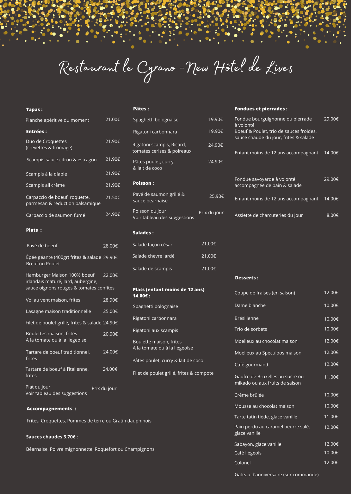 Les plats et tarifs indiqués sur cette carte en ligne sont donnés à titre informatif et peuvent être modifiés sans préavis. Seule la carte disponible au restaurant fait foi.